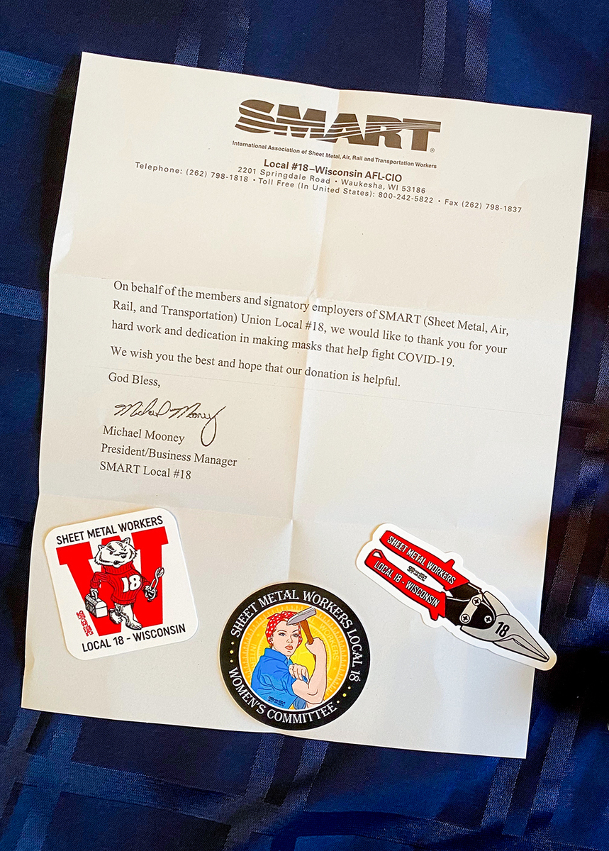 When it comes to helping keep our fellow workers and those around them safe and healthy, there’s a role for everyone. When Brigade volunteers sewing masks said they wanted to include metal nosepieces like many commercially-produced models have, The Sheet Metal, Air, Rail, Transportation workers union (SMART) Local 18 stepped in. They designed, produced and donated SMART Strips, the exact metal strips that were needed. That’s union solidarity in action. Thank you to Mike Mooney, President/Business Manager SMART Local 18 and member of the Wisconsin AFL-CIO Executive Board, for facilitating the donation of metal nosepieces to the Union Mask Brigade makers.